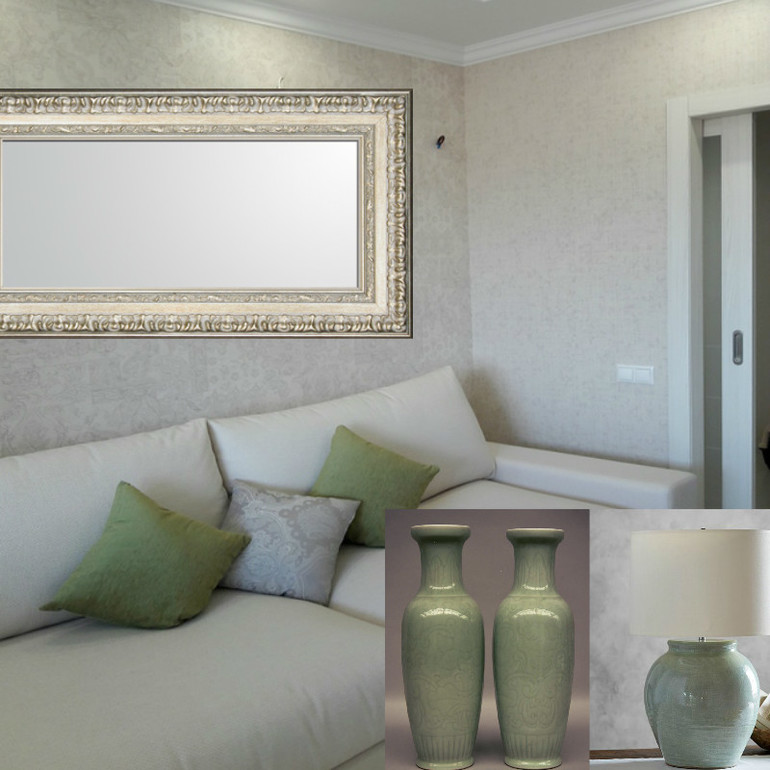 вот прикинула ещё зеркало ,конечно в прямой минималистичной раме более было бы логичнее т.к к этому подталкивает форма дивана ,но я люблю иногда не логичные шаги в интерьере
