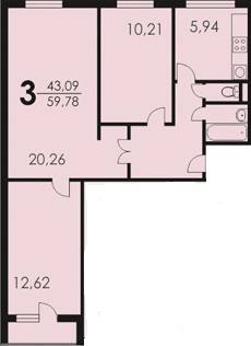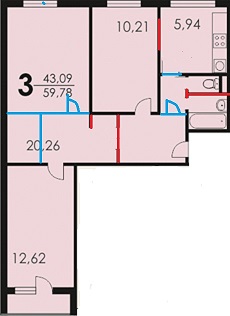 Санузел совмещается с коридором, что ведёт его увеличение. Кухня огораживается от коридора стеной.