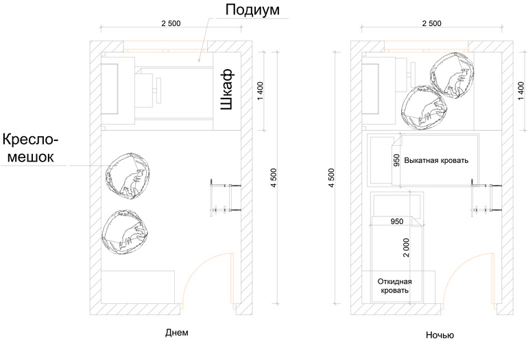 С использованием подиума и откидной кровати.
