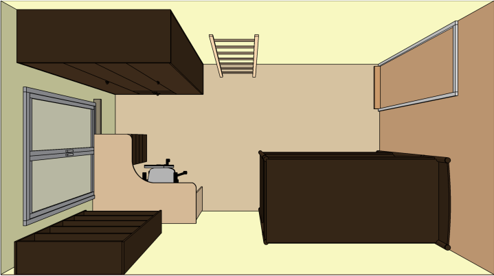 Шкаф по стене где дверь, чтобы не крал свет. У окна большое рабочее место. По бокам от окна и над ним куча закрытых полок и ящиков как доп. места хранения. Две остальные стены: кровать, напротив шведская стенка (которая вдоль стены крепится).