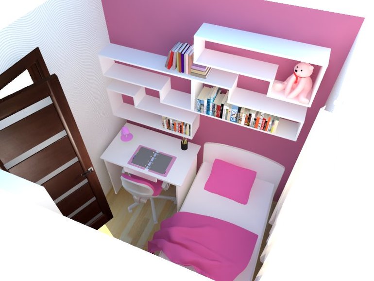 Почему кровать поставили под окном. Если бы стол встал под окном, то куда бы мы с вами повесили полки? Высота нижней полки от поверхности стола не более 25 см, что очень комфортно для ребенка, который делает уроки. Если поставить на место стола кровать, то высота полки от спального места будет 50-40 см в зависимости от высоты матраса, что не очень комфортно. Или полки вдоль кровати нужно будет убирать. Кроме того и полки с другой стороны нужно убрать, т.к. они будут мешать.