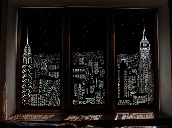 Нет. Это плоттерная резка ..там же написано :,,Иллюзия ночного города или ночного неба создается при помощи отверстий в ткани".