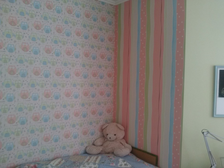 И у нас такие.. Одна стена полоски, вторая однотонные зеленые из этой коллекции, и чуть совят где двери. Но тон светлее, эти показались очень яркими..