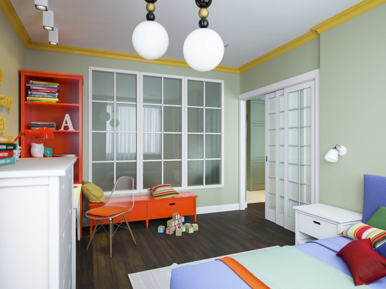 По левой стенке - компьютерный стол(рабочее место мужа) и стул, стеллаж с полками или гипсокартоновая перегородка с полками(в качестве разграничения зон), угловой диван (или обычный, зависит от стеллажа, диван он же кровать), тут останется место и пока неясно, что ставить(возможно купим сухой манеж для ребенка, далее - книжный шкаф, рядом кресло-качалку или просто кресло),