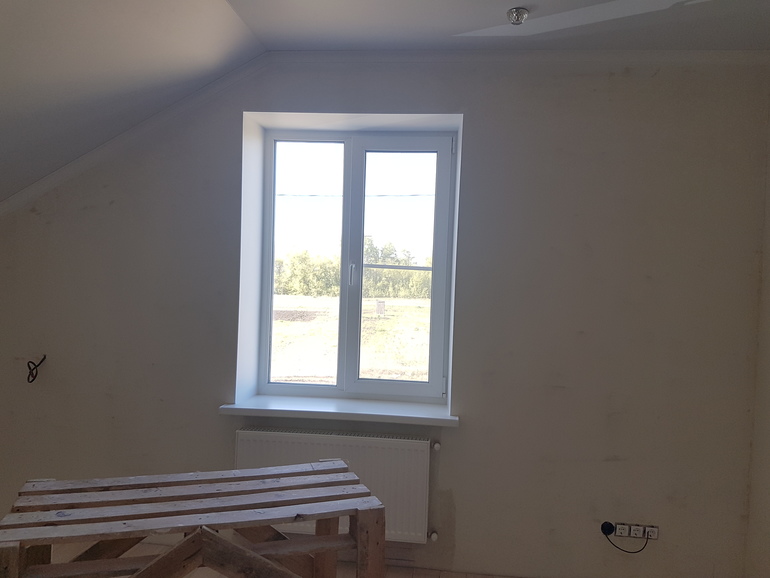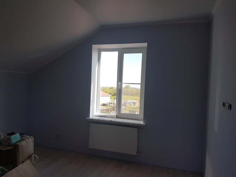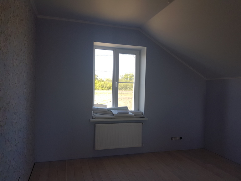 Спальня (30 кв.м.) -распашонка . Нижняя точка потолка по скошенной стене 166 см. Окно обычной ширины /высоты