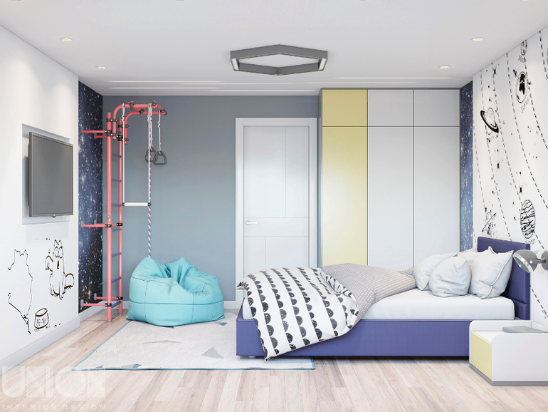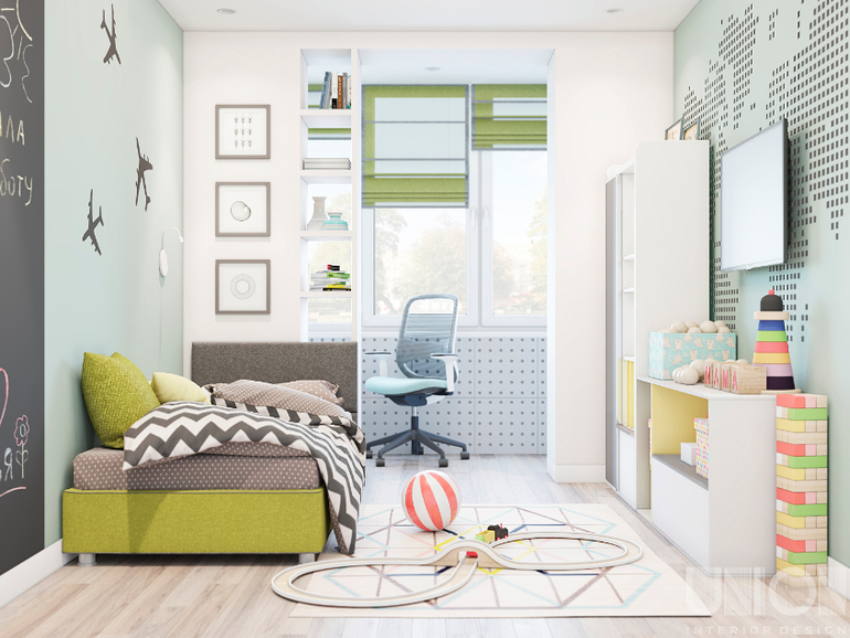 -кухню перенесли и объединили с гостиной , что дало возможность сделать две детские комнаты