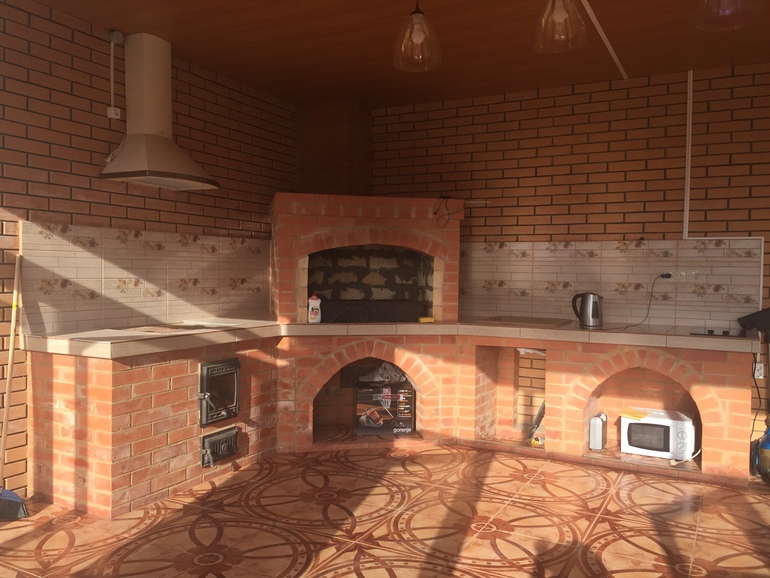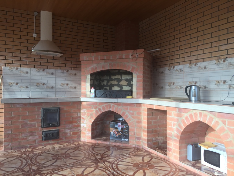 Рисунок на полу можно было не делать,а просто что-то однотонное,чтобы эта конструкция из кирпича выделялась отдельным предметом.С фартуком так же намудрили.