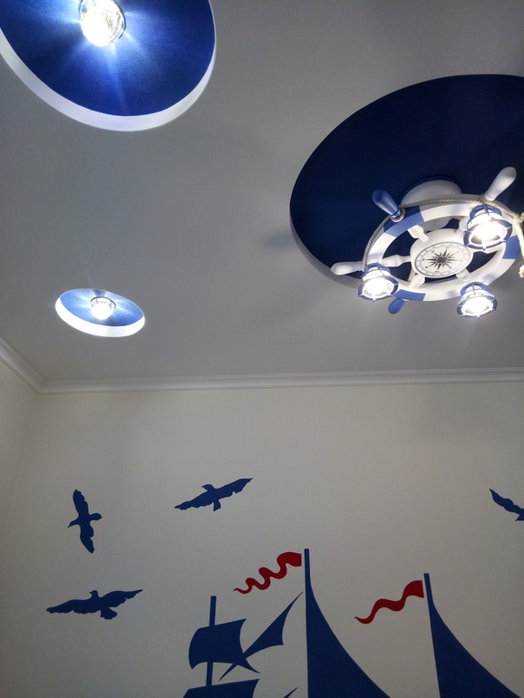вот так будет выглядеть, т.к. комната небольшая, предлагаю отступить от потолка 1/12, чтобы зрительно она смотрелась просторнее. И, если речь о детской в морском стиле, ссылка на проект, может пригодится:))