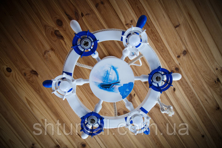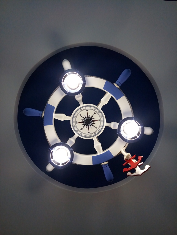 На потолке 5 кругов, в самом большом по центру люстра в виде штурвала бело-синяя,в остальных точечные светильники, кровать белая с тематическим покрывалом( еще не выбрала), шторы тоже бело синие, но вот их буду заказывать после поклейки обоев, чтоб понять, какие я хочу.). Подушки в виде спасательного круга, ночник эгло. планирую так, там будут свои коррективы.