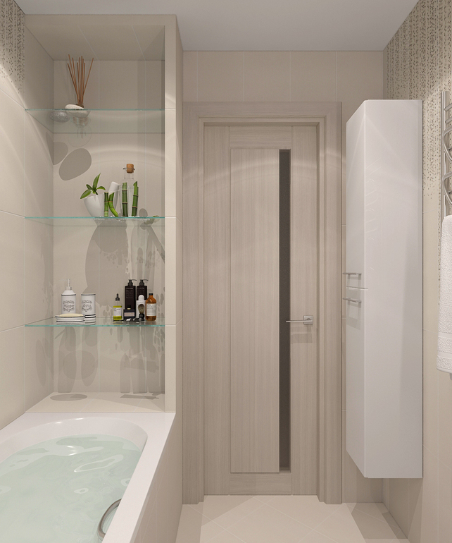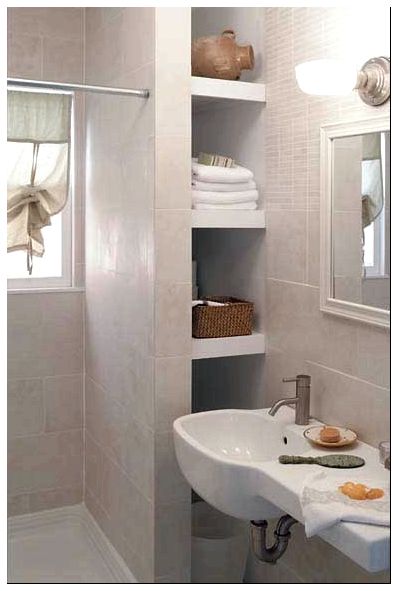 У нас так было на съемной квартире. Там строили перегородку, за которой висели полотенца. Т.е. Возводили стену до уровня душевой, образовывался закуток, в котором хорошо размещались все ванные принадлежности