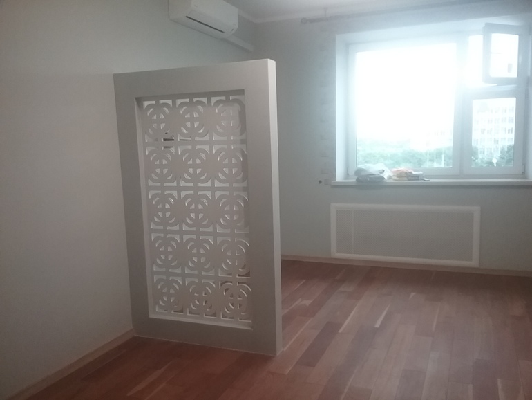 Дд, вот какая перегородка у нас получилась. Основа резная деревянная панель а рамка гипсокартон.