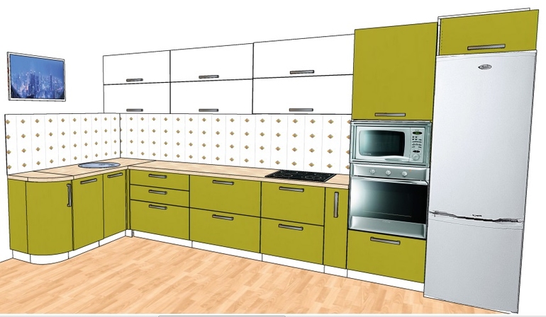 Добрый день, напишу свое мнение как специалиста. Первое на что я обратила внимание - это бутылочница, не очень функциональный шкаф, хотя многие думают иначе и могут со мной не согласиться, рекомендую убрать ее и сделать симметричный выдвижной элемент из двух вместительных ящиков. Визуально такие узкие шкафы делают конструкцию гарнитура дробной, удешевляя ее вид. Да, еще и стоит она рядом с двумя большими колоннами - размерный дисбаланс. Что касается радиусных (закругленных элементов) - уже не в теме. И они удешевляют красивый гармоничный гарнитур. Что еще бросается в глаза - так это фартук на второстепенной стене, это выглядит, будто на верхние шкафы денег не хватило, и поэтому пришлось повесить телевизор. Лучше всего будет оформить стену единым полотном, чтобы она не казалась дробной и выглядела более эстетично и цельно. Например отделать той же плиткой (мозаикой) до потолка всю стену, либо оклеить стену обоями, а уязвимое место под фартуком оформить стеклянной прозрачной панелью (так называемой скинали). Но это в том случае если кухню оставлять угловую, но без закруглений, пожалуй. Делюсь парочкой своих идей, вот есть и с закруглением, если сильно уж захочется)