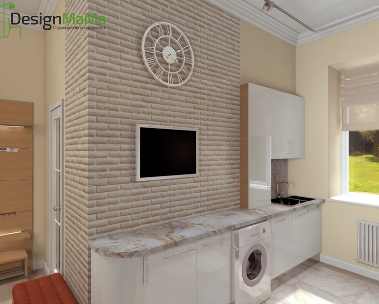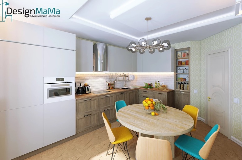 Мне такой вариант пришёлся по вкусу. Вроде и угловая кухня и в тоже время облегченно, незагромождено смотрится. Наш проект