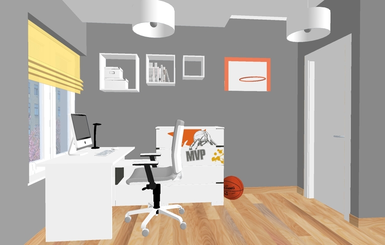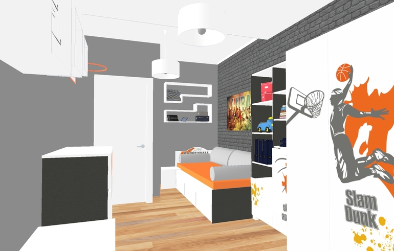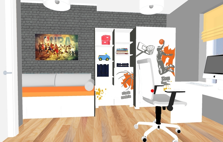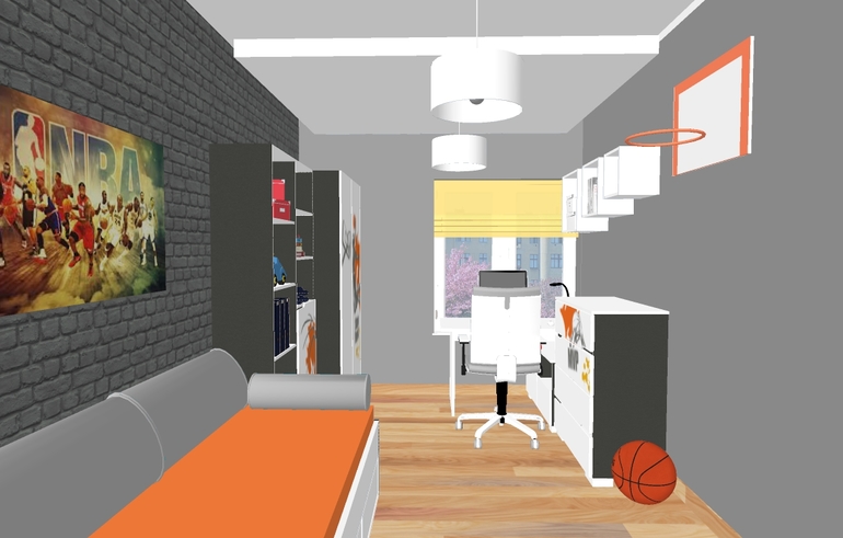 Интерьерное решение детской комнатыРешила изменить комнату сыну. Ему уже скоро 8 лет. Увлекается баскетболом и акробатикой. И вот, что мне нарисовали: