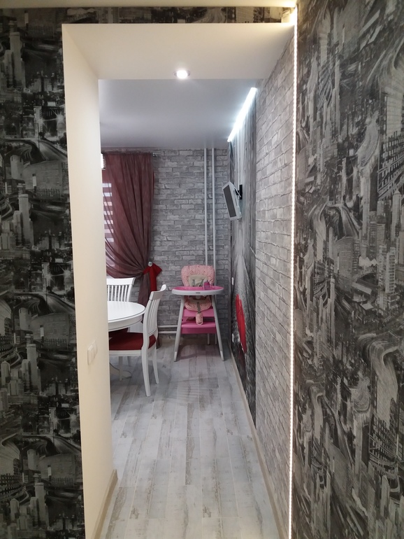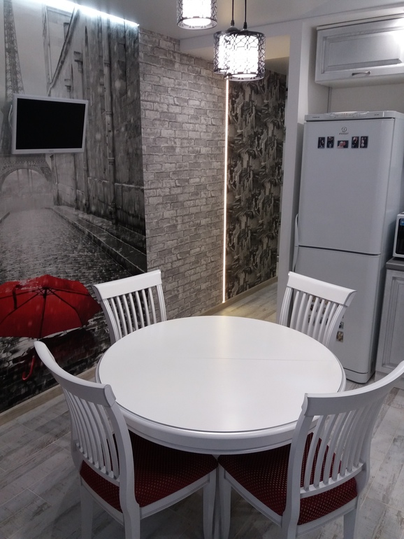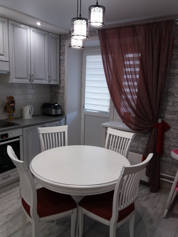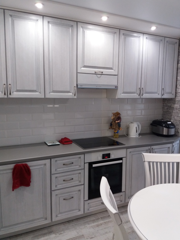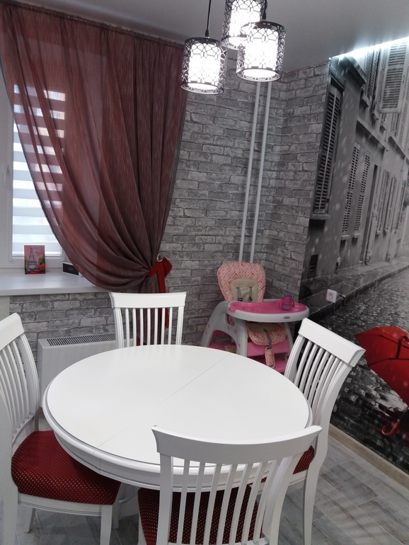 Трубы пока не закрыли...что-то декоративное нужно придумать, но пока нет ни времени, ни денег) холодильник пока тоже старый...сделали проём под 2-х метровый. Со временем тоже прикупим) И под вытяжкой остался кусок крашеной стены над фартуком..косяк)) планирую туда картинку (как скинали) сделать... только не знаю, возможно ли это технически... Если кто знает, подскажите, пожалуйста! И по поводу стола...нужно его чем-то покрыть? Всем виртуальным гостям моей кухонки, хорошего дня!!!!)Ольга* счастливая мама