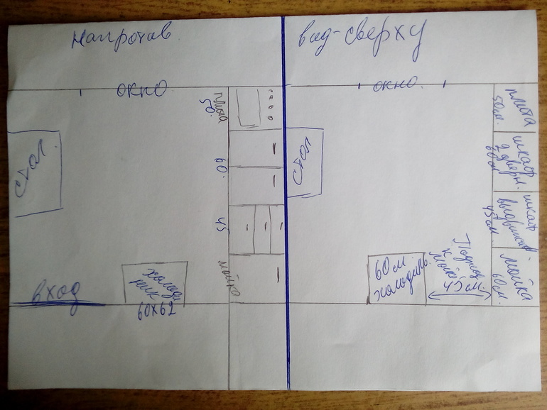 ---Убрать угловой навесной шкаф и весь гарнитур выставить по одной стенке и холодильник оставить у входа....-- но муж опасается,что 45 см. будет мало для подхода к мойке..
