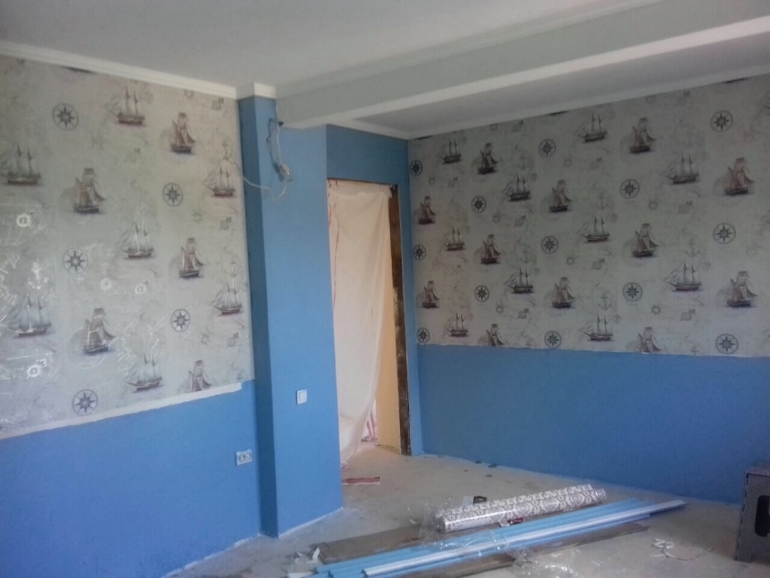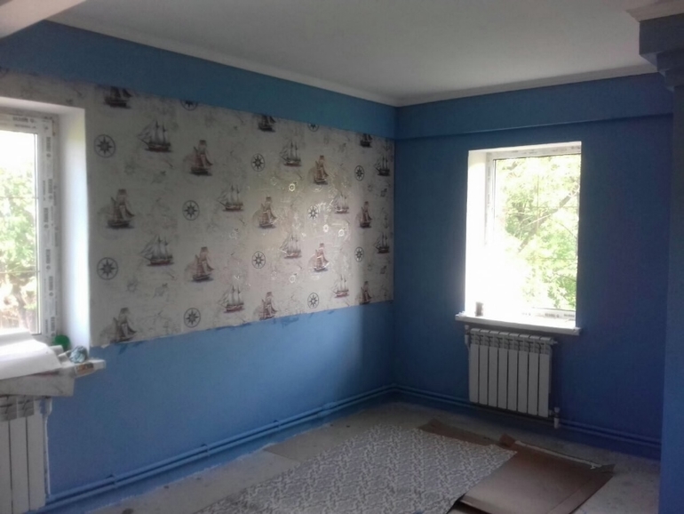 И молдинги белые приклейте, их в любое время можно будет потом покрасить в синий если очень захотите.