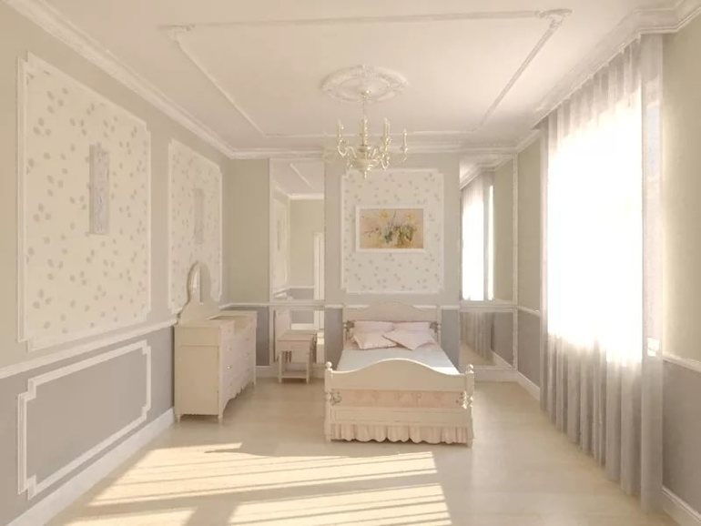 обычно молдинги делают в изголовьи кровати, в зоне ТВ, над диваном