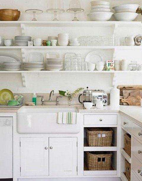 Я себе представляю кухню в слегка деревенском стиле, поэтому если какие-то полки не понравятся в использовании, их всегда можно прикрыть красивой шторкой, грифельной доской и т.п. Это только усилит эффект стиля:) ну, мне так кажется.