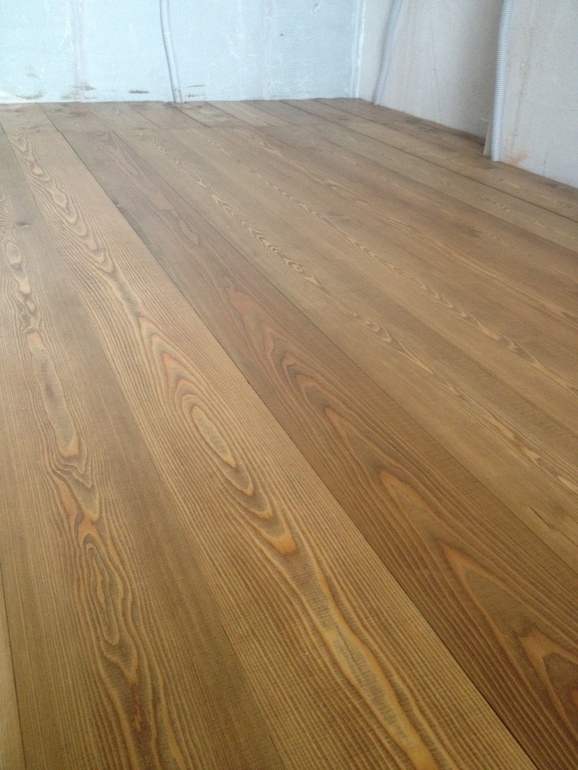 Стены цвета "взбитого сливочного масла", как я его называю:) а пол из лиственницы, затонирован маслом под дуб, очень красивый!