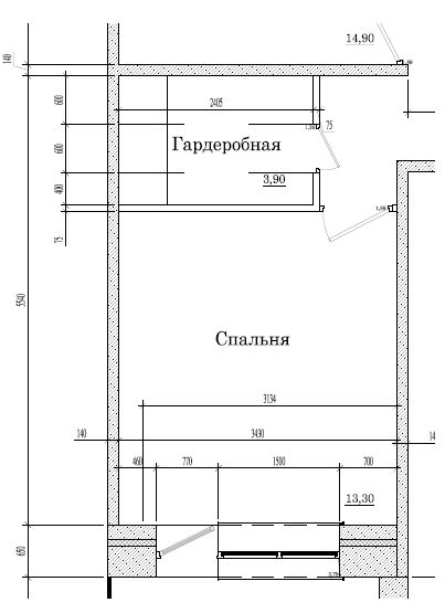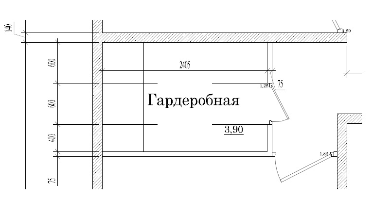 Это вид из комнаты, проем справа это место, где раньше была дверь в комнату. Жаль чертежа на работе у меня нет, так было бы понятнее. Приоткрытая дверь, это дверь в гардеробную. А это сама гардеробная: