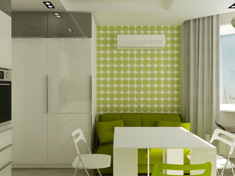 Стационарные барная стойка и полноценный обеденный стол не помещались в этой площади. Я придумала сделать поворотную барную столешницу и стол обеденный нашла универсальный. В сложенном виде это консольный столик у окна. В разложенном виде его ставят у дивана, а барную поворачивают к окну. Выглядит это вот так