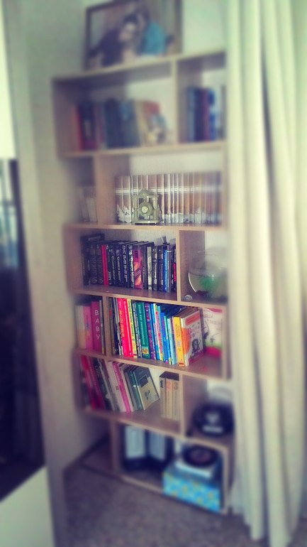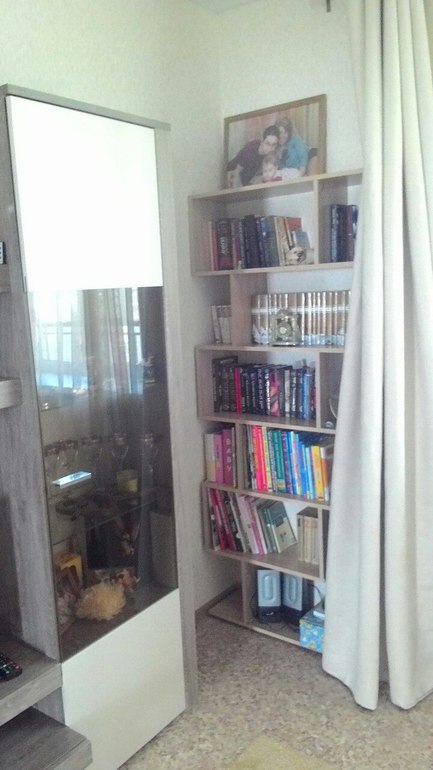 А второе (только не бросайте помидорами сильно) есть книжная полка,(она стоит прямо перпендикулярно стенке, в углу) которую мы не продумали заранее, а книги надо было куда то ставить (точнее я представляла куда, но в последний момент все переигралось) и не совсем к лучшему. она совершенно не попадает под общий концепт гостиной, .... закрываю шторкой) вообщем вот... И что с ней можно сделать совершенно убрать.переставить,заслонить закрыть, может как то декорировать) вообщем верю в чудеса и время креативных идей)))