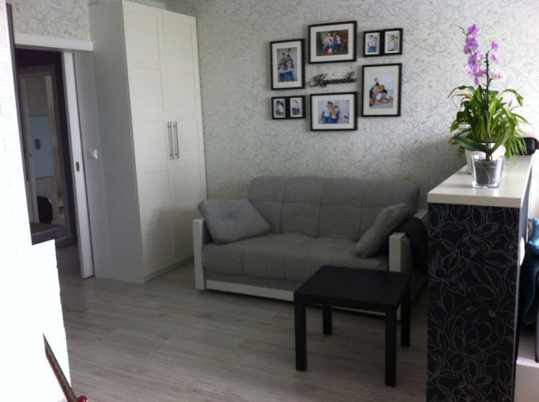 Вид с кухни, надпись нашей фамилии муж решил вырезать сам из фанеры, ручным лобзиком)