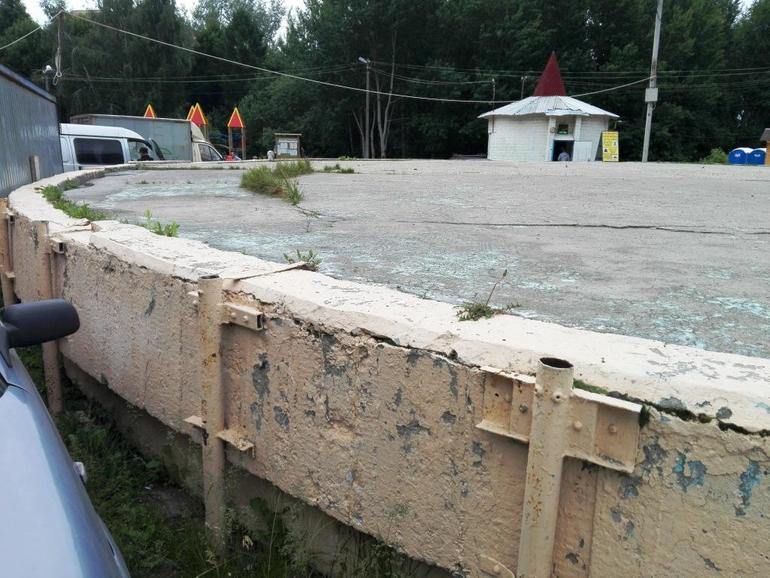 Таблетка медленно, но верно разрушается. Сквозь бетон растет трава, много трещин. Нет ограждений - небезопасно для детей.