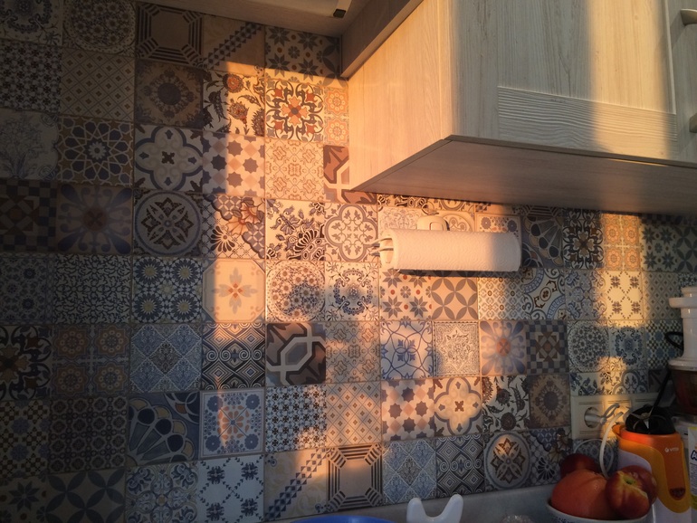 Плитка отличная. Со светлой однотонной кухней и столешницей смотрится вообще супер. Все кто видят - в восторге. Уже год у нас, совсем не надоела, кухня - моя гордость))))) В уходе отлично, она гладкая, всё легко стирается, а из-за рисунка брызги от плиты сильно не видны.