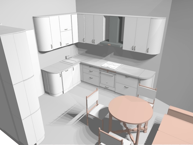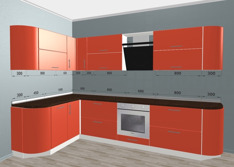 У меня белый глянец (правда не так давно) - пока очень довольна , в уходе без проблем вообще! Радиусные фасады, говорят уже не актуально ;) ( я сама "немодная" , у меня в спальне имеется))) Чисто визуально меня смущает "частокол" из узких , 30см дверок на верху ... а секцию , которая открывается наверх, я бы сделала с общей складывающейся вверх дверью, а не с 2 отдельными..