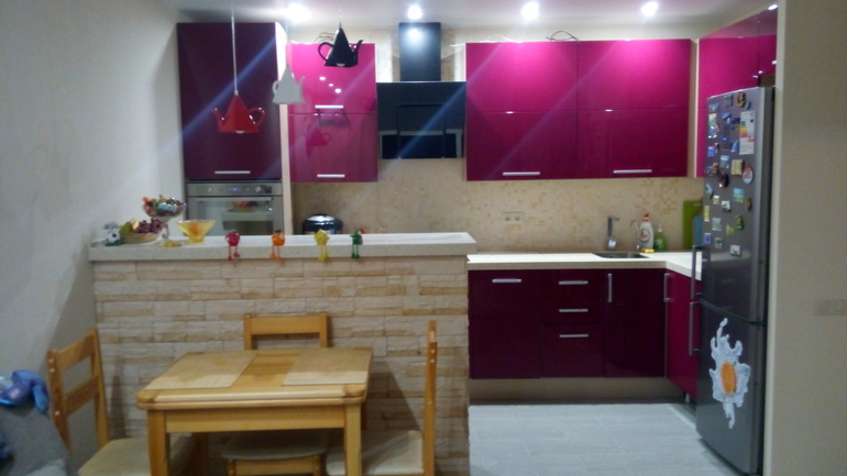 У меня тоже яркие глянцевые фасады. Стол стеклянный,другого даже не представляю.