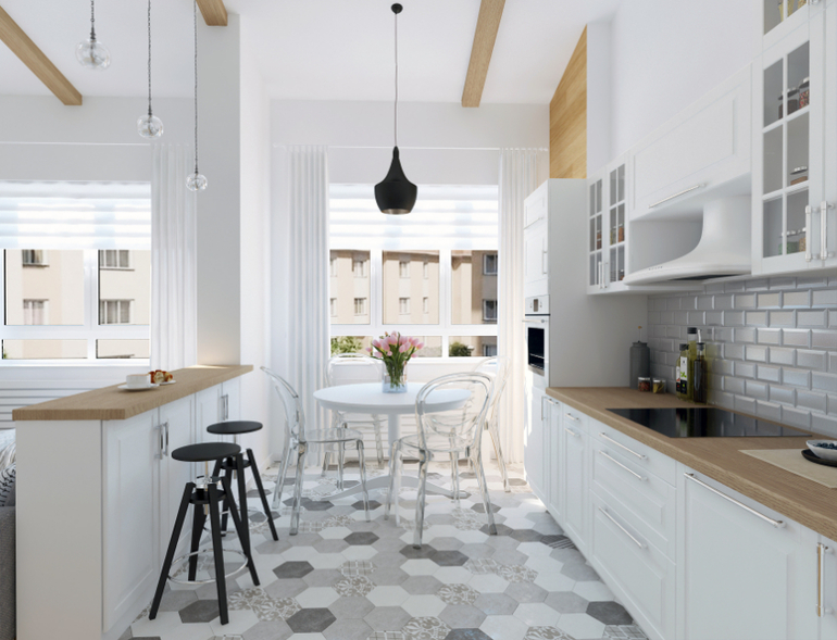 У нас очень похожий интерьер планируется))так же шестигранник и доска,только у нас гексагон с пола на фартук переходит.И поярче так получается.может вам пригодится))если интересно попозже кину картинку