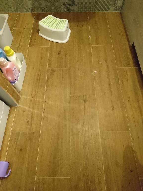 Нет, чуть фактурная. Не гладкая, но и не борозды. Мыть легко. Я даже от затирки её спокойно отмыла, а рабочие там неплохо так наляпали. Плитка прямо как настоящее дерево выглядит, а когда с тёплым полом так вообще как будто по дереву ходишь.