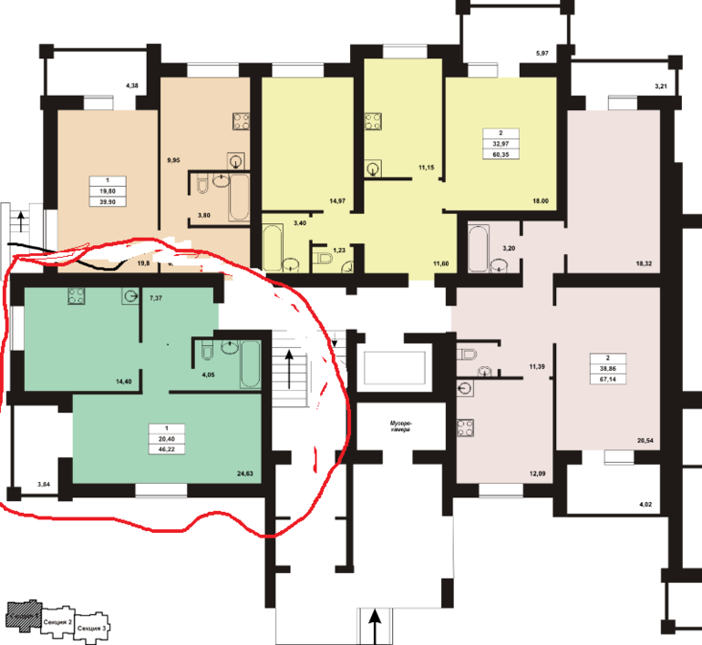 наша квартира выделена зелененьким. Два окна, свет с двух сторон, если будем выкладывать вдоль длинной стены - комнату вытянем, а она и так узкая и длинная (длина комнаты 6,7м). Если вдоль короткой стены с выходом на балкон - комнату расширим немного, но как-то непривычно. Прошу советов и мнений.