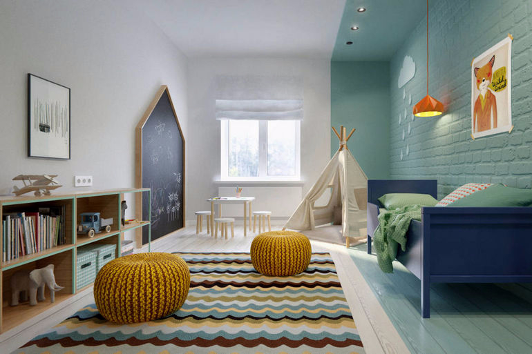 Мы думали одну стену в детской сделать цветной, остальные белые, но так и не определившись с цветом, "пока" покрасили все в белый. Когда положили яркие коврики, на стену повесили карту мира большую, стало ярче, но в то же время так приятно, спокойно :) еще шторку добавим и на стены декор -картинки, фонарики или флажки, может, наклейки виниловые звездочки какие-нибудь, пока не решили) детям 4 и 6 лет. В общем, мой вывод - детская всегда будет яркая, даже если стены белые, так что не переборщите с цветом :)