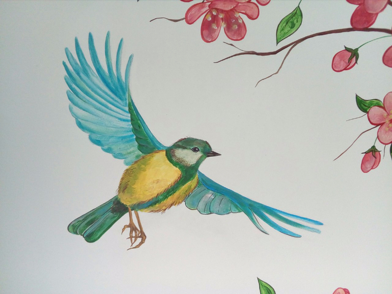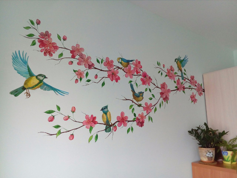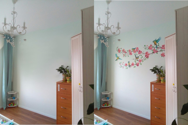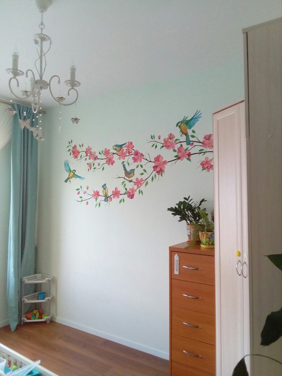 Роспись получилась очень нежной и преобразила комнату, создала в ней уют и новую атмосферу.