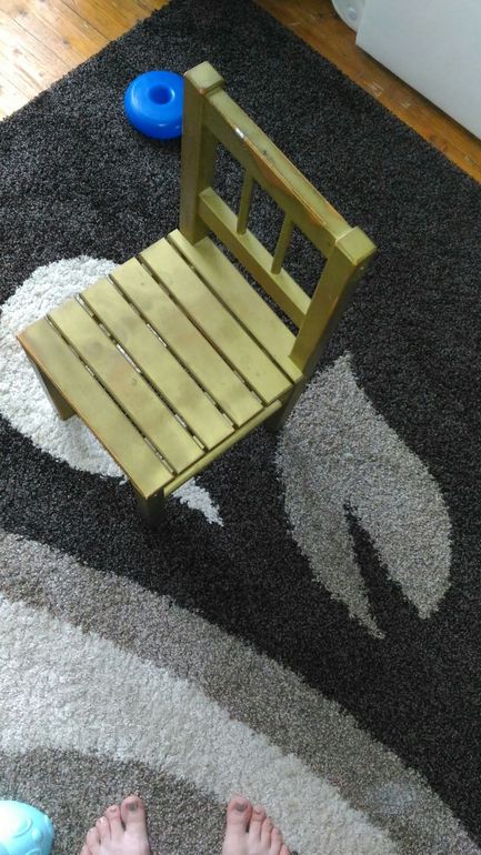 Акриловым, он без запаха и сохнет за час. В магазинах для рукоделия посмотрите для декупажа. Я стол и стул красила из балончика и не покрывала ничем. Сначала в красный, потом в золотой. Со временем стирается, но зато быстро.