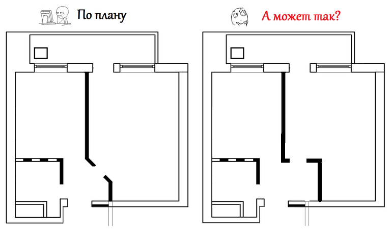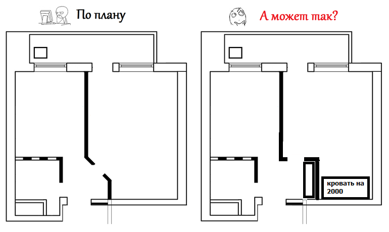 Перепланировки стен. Согласование перепланировки квартир и нежилых помещений.В общем, дана такая однушка с коридорчиком-пятачком в 3 квадрата. Есть идея убрать диагональную стену с дверным проемом между коридором и комнатой, тогда может получится втулить шкафчик в нашем предбаннике. Но. Но. Стоит ли эта кутерьма с оформлением перепланировки (стенка не несущая, но все же), разбором кирпича, нагромождением новых стен? Опять же, я даже примерно не могу представить в какую сумму эта фигня выльется, да и проходная кухня - тоже не самая лучшая новость. Но главное - такой план съест жилую площадь, от 17 где-то 16 останется, это не критично для жизни, т.к. существующий скос функционального значения не имеет, разве что визуально расширяет пространство, однако при продаже может это будет иметь тайный смысл. В общем, надо ли но?