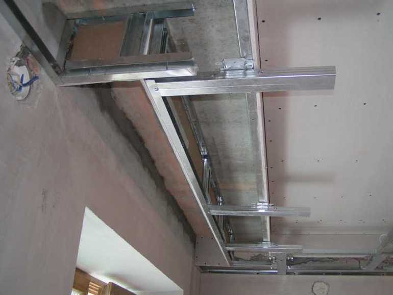Здравствуйте! Вот пример металлокаркаса для ГКЛ потолка с нишей для штор, если я Вас правильно поняла.