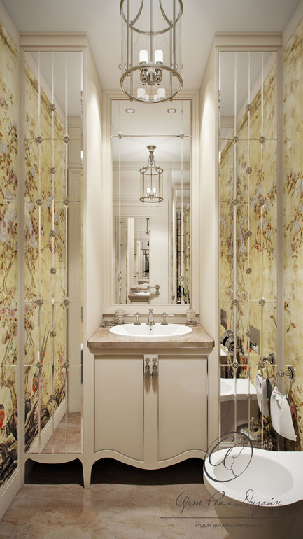 По картинке: я бы оставила обои только на одной стене, зеркал поменьше и без разлиновки (просто гладкие). Нравится, что обязательно надо оставить, пол, спокойные стены, высокий плинтус, аксессуары для всего в одном стиле, чтобы всякие пшикалки-вонючки не портили вид.