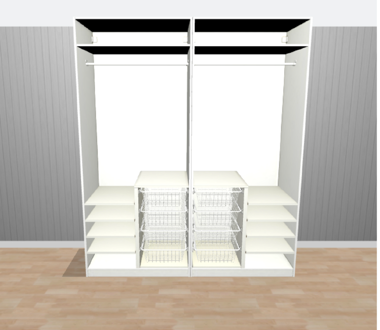 Гардероб Пакс, собирала сама в планировщике на сайте Икеа, 200*60*236, наполнение такое, как на фотографии ниже, только корзины по бокам с каждой стороны. Хотя одежды у детей много шкаф не оказался заполненным, еще есть даже пустые полки.