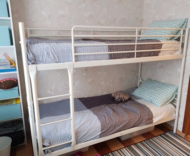 Белье, покрывала, подушки, также все икеа. На кровати на каждом этажи прикрепили бра.