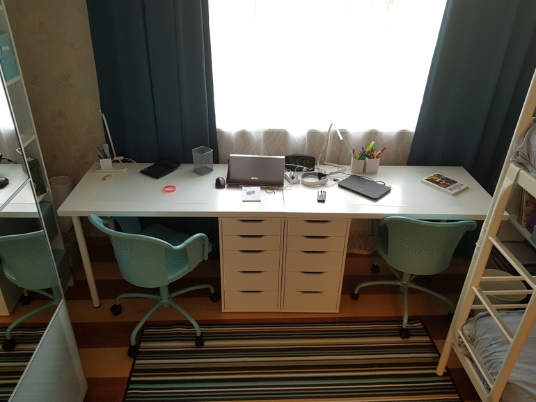 2 рабочих места, сбоку стеллажи с для книг, учебников, игрушек, косметики и т.д. Все мелкие предметы убрали в коробки. Для каждого ребенка свой стеллаж.