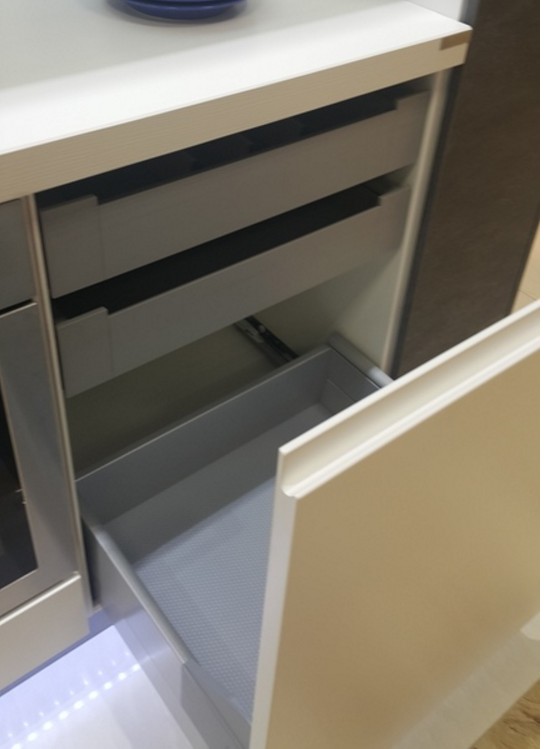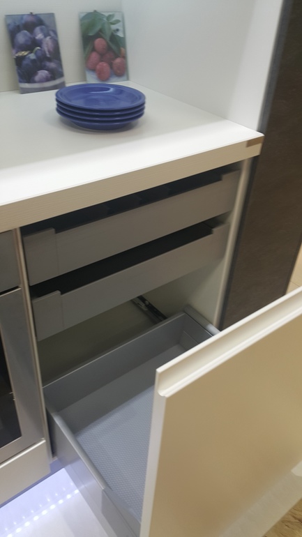Добрый день! 1) Механизмы для такой глубины можно посмотреть в Цетрокомплект, например, или в подобных фирмах, торгующих фурнитурой. Но, думаю, их немного (механизмов) для такой глубины. 2) Почему длина ящика 66, а не 60? 3) Такую полку могут вырезать на фабрике, где будете заказывать кухню. Лучше взять такую ручку (presa hook) вместо скосов, для нее больше ничего не нужно. А для скоса, чтобы открыть, нужно ставить профиль - голу, а это допсредства.)) http://makmart.ru/profiles_with_internal_rounding_gola/ И выемка - интегрированная ручка внизу фасада тоже удобна. Хотя они могут быть одинаковыми снизу и сверху. Выглядит, примерно, так: