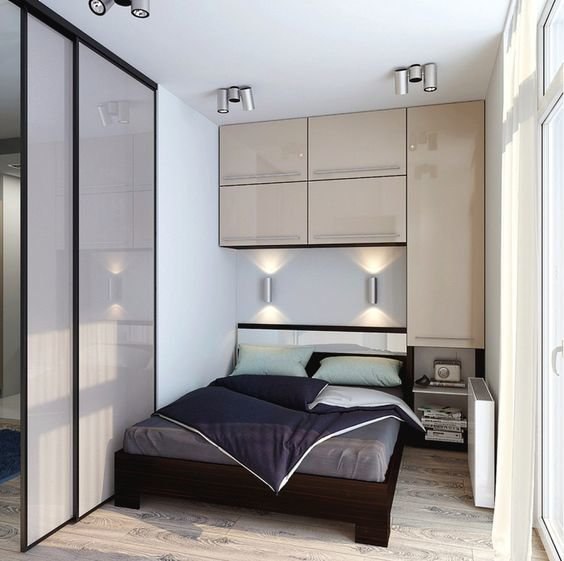 Второе, касается деления комнаты на зоны. Здесь хочу выделить спальню и детскую: комнату хотим перегородить раздвижными дверями, примерно выделить себе 6 кв и поставить туда кровать двухспальную ( именно кровать, я семь лет сплю на диванах и не чувствую себя человеком по утрам), небольшую мини стенку, а именно комод, шкаф-пенал или какую систему хранения. Как вариант Бесто икеевская. Ну вот представляю это вот так: