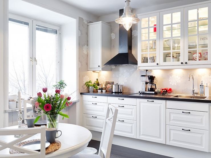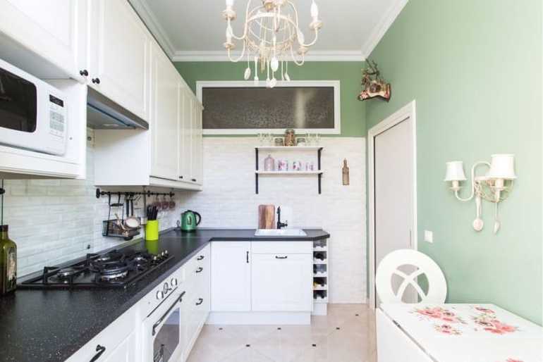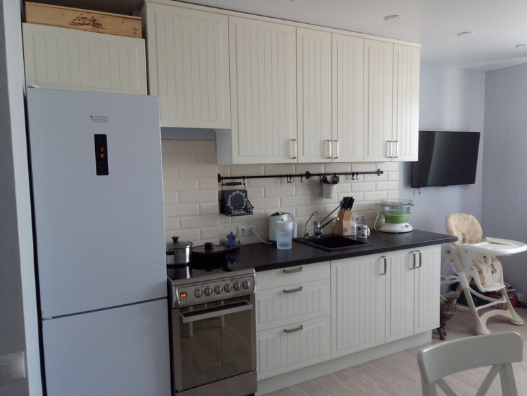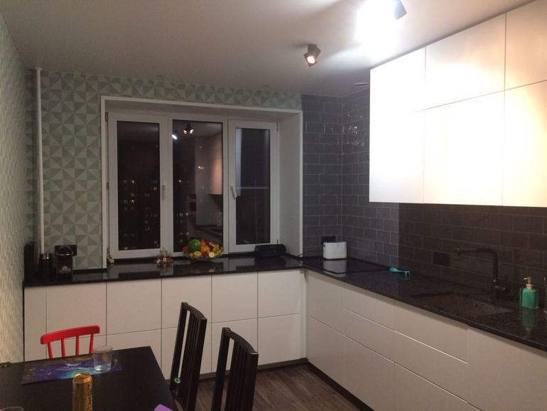 У меня кухня почти 6 квадратов, белый гарнитур, светлая плитка на полу и фартуке, 2 чёрные стены и чёрный холодильник. Ужасно боялась делать, муж настоял. И не давит! Круто смотрится, я очень довольна