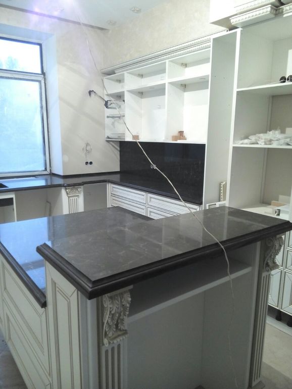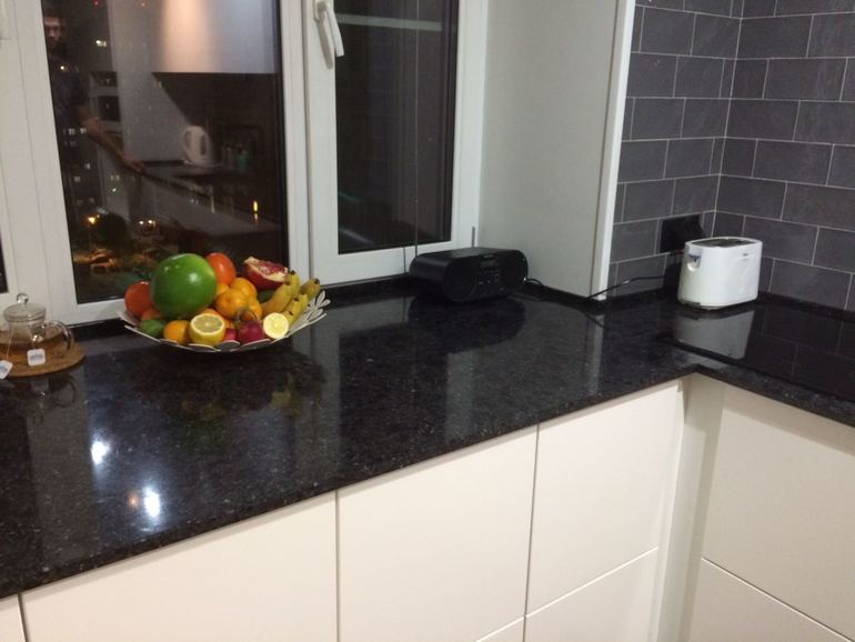 И к ней, волей случая и по хорошей скидке, была заказана черная столешница из кварцевого агломерата цвета Гоби Блек.