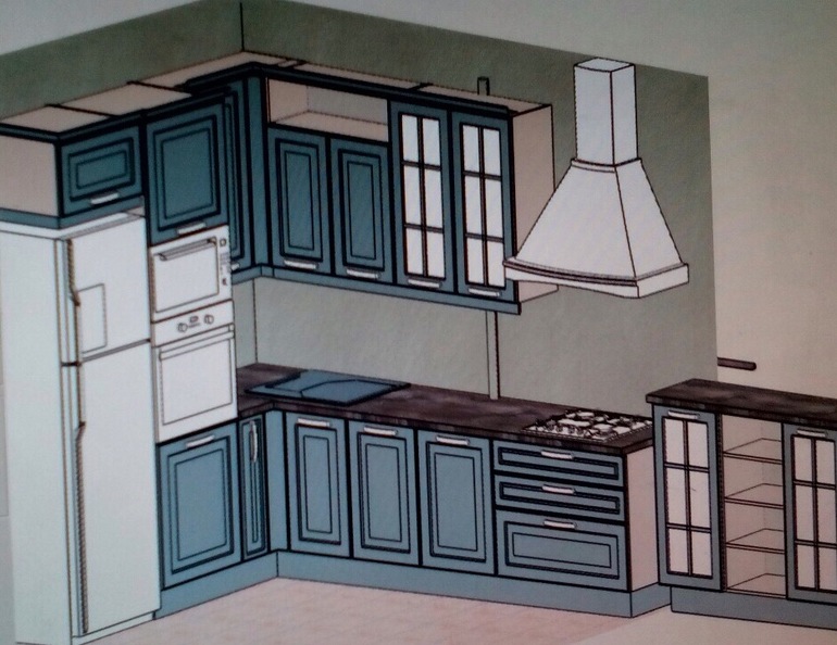 Мойку в углу ,а плиту над распашными ящиками вытяжку встроить, или ящики после вытяжки. а так у вас и распашные и выкатные не рабочие будут.