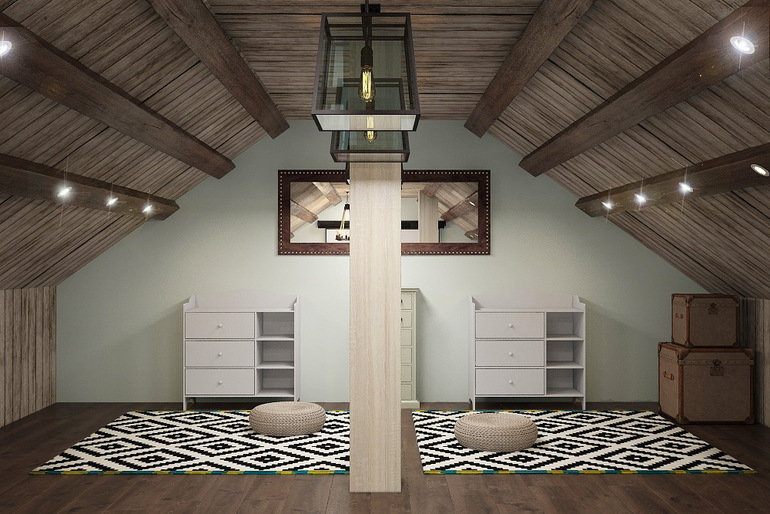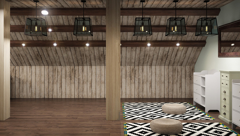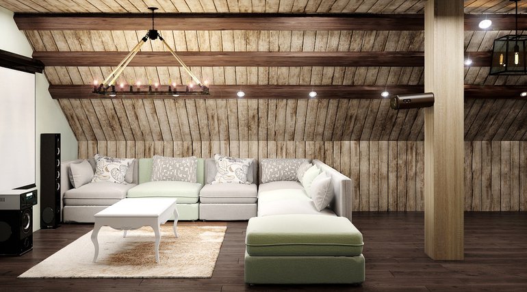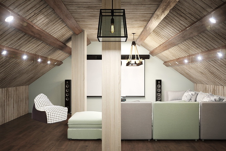 Третий этаж представляет из себя мансарду открытой планировки, визуально разделенную на зону домашнего кинотеатра с прожектором и игровую для детей.